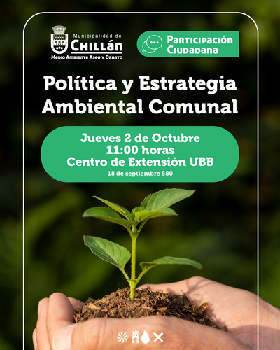 Este jueves 2 de octubre (Día Nacional del Medio Ambiente) a partir de las 11 horas en el Centro de Extensión UBB (ubicada en calle 18 Septiembre 580) se llevará a cabo la Jornada de Participación Ciudadana “Política y Estrategia Ambiental comunal”, la cual busca plasmar ideas en la estrategia ambiental 2026-2030.