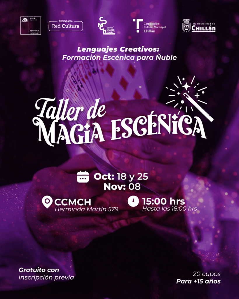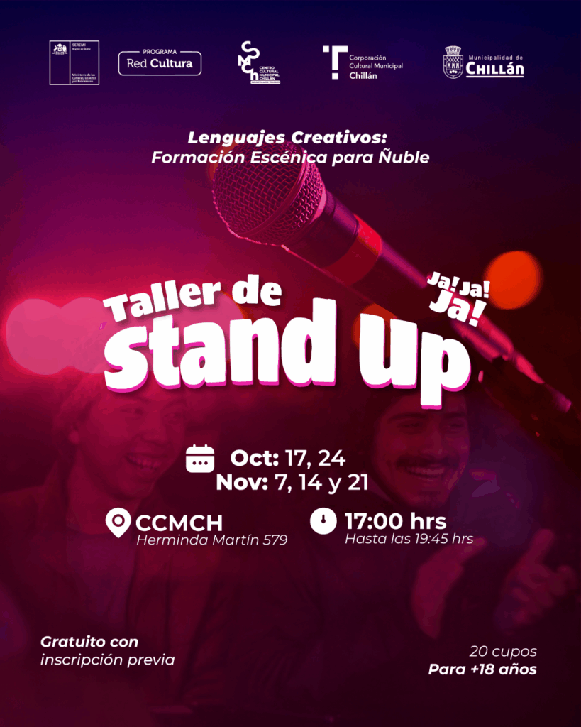 Cabe destacar que, los formularios de inscripción a ambos talleres se encuentran disponibles en las plataformas digitales del Centro Cultural (@ccmch_). El taller de Stand Up se dictará los días viernes 17 y 24 de octubre, y 7, 14 y 21 de noviembre, y el cierre se realizará una presentación abierta al público el sábado 22 de noviembre a las 19:00 horas; y las clases de Magia Escénica, se realizarán los sábados 18 y 25 de octubre, y 8 de noviembre, culminando con una función final el sábado 8 de noviembre a las 19:00 horas.