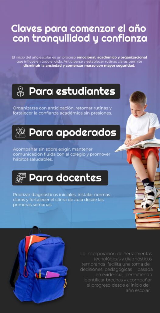 · Confianza académica: El comienzo del año es una oportunidad para fortalecer la confianza en el aprendizaje. Revisar contenidos del año anterior sin presionar, tratar de establecer un espacio fijo de estudio en el hogar y promover la autonomía progresiva según la edad, son medidas que pueden tomarse antes del inicio del nuevo ciclo académico. Más que enfocarse exclusivamente en las notas, es recomendable reforzar el valor del esfuerzo, la constancia y el progreso personal.