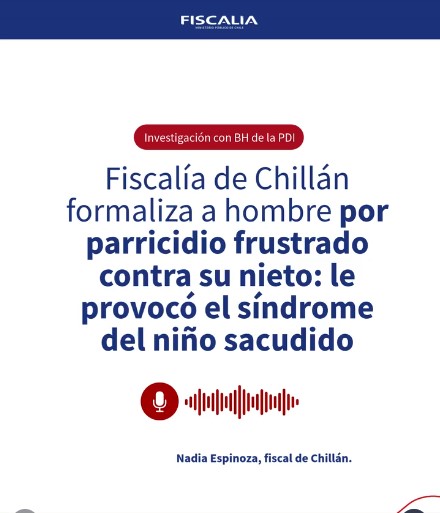 La Fiscalía de Chillán formalizó por el delito de parricidio frustrado a un hombre de 49 años, a quien se le investiga por provocar el síndrome del niño sacudido en su nieto de 3 meses y 21 días de edad, a cuyo cuidado se encontraba, en esta ciudad.