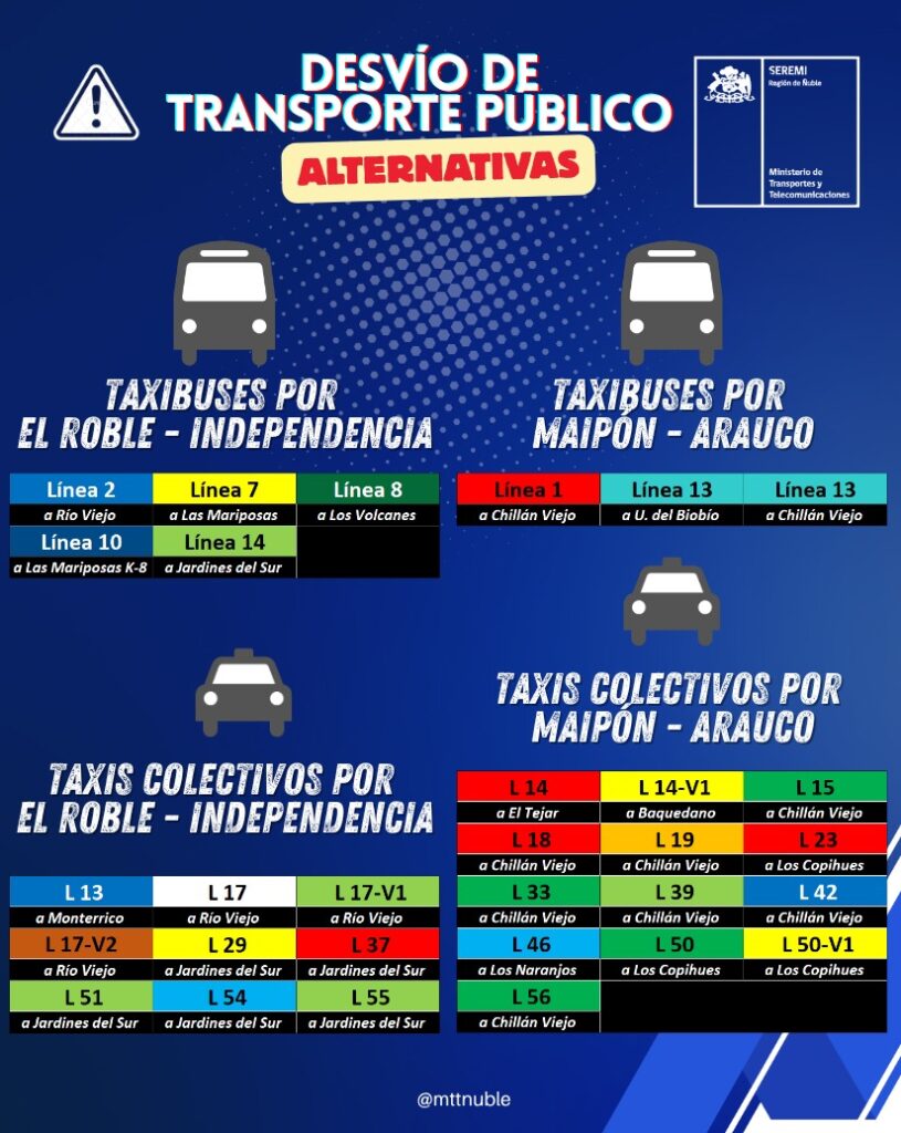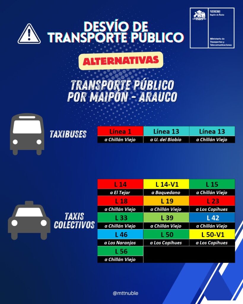 Por otra parte, los servicios que circulan por Maipón y Arauco deberán modificar su recorrido por Isabel Riquelme, Maipón, Arauco y Avenida Collín. En este grupo se encuentran la Línea 1 a Chillán Viejo y la Línea 13, tanto hacia la Universidad del Biobío como a Chillán Viejo.