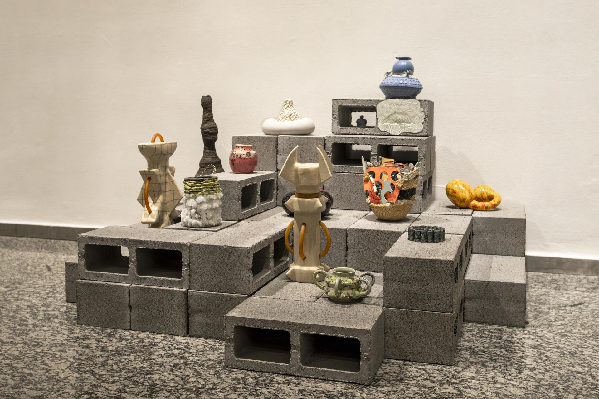 El montaje incorpora elementos industriales y arquitectónicos que evocan distintos contextos en los que la cerámica circula, como el taller, la bodega o el archivo, ampliando las posibilidades de lectura de cada obra según su ubicación y relación con el conjunto.